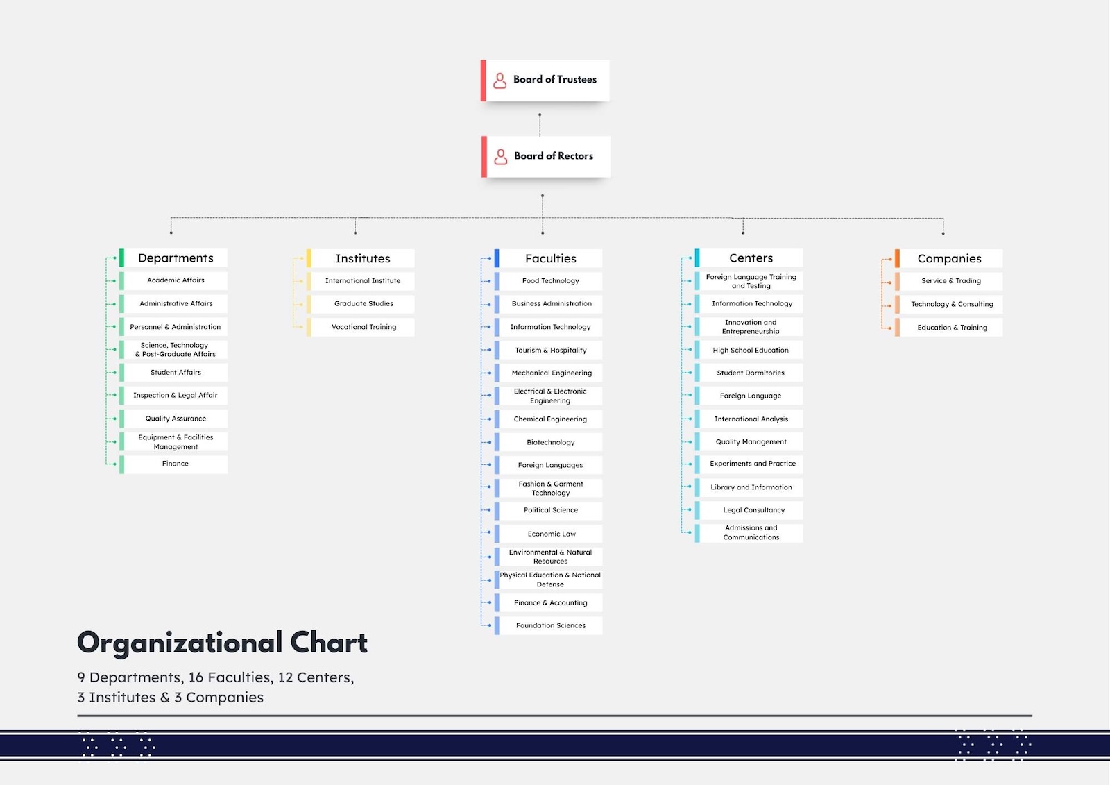 Dưới sự điều hành của Ban Giám hiệu, hệ thống tổ chức của Nhà trường được phân thành các nhóm chính gồm: các phòng/ban chức năng, các khoa đào tạo, các viện, các trung tâm và các đơn vị doanh nghiệp trực thuộc. Mỗi đơn vị đảm nhận những chức năng riêng, đồng thời phối hợp chặt chẽ nhằm đảm bảo chất lượng đào tạo và hiệu quả hoạt động chung.
